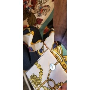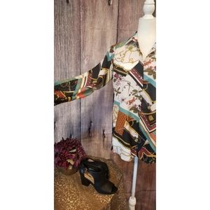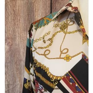 This blouse is incredibly gorgeous. Its beautifully designed with floral prints and chain links. Light, comfortable material.