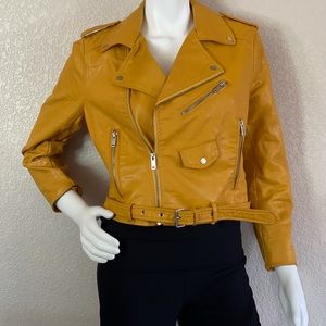 Mustard yellow vegan leather cropped Zara jacket! Some normal signs of wear, but in great shape. As typical with vegan leather, there are a few tiny spots of cracking or peeling. Zipper and all hardware work perfectly. Goes with everything, perfect for spring.