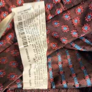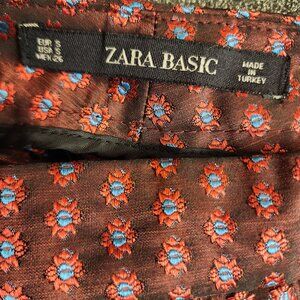 The Zara Basic Pants in size Small are maroon dress pants with a floral pattern and side stripe detail. They feature a high-rise waist, a straight leg style, and a zip and button closure. Made from polyester, these pants are machine washable and suitable for travel, weddings, parties, and casual wear. The stylish design and vibrant red color make them a versatile addition to any woman's wardrobe, perfect for all seasons.