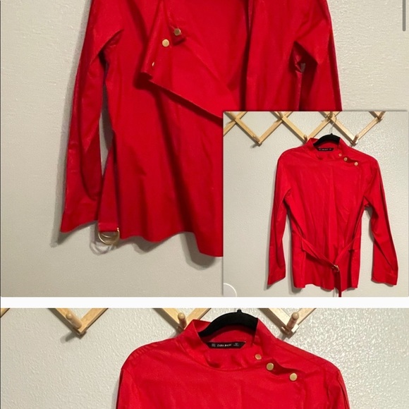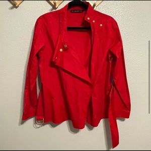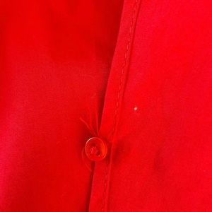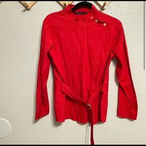 Red long sleeve top with a built-in belt, 3 buttons top front, and a tiny button inside to the wrap blouse. Purchased but never worn. It has some loose threads (see last 2 photos).
