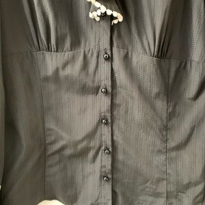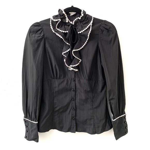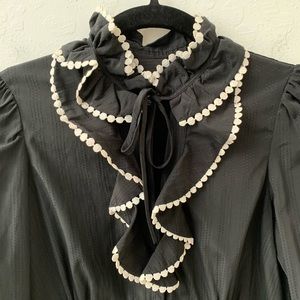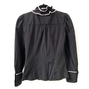 Zara Basic black long sleeve top with ruffle front. Cute round buttons on the sleeves and down the front, and tie closer to the neckline. Lightweight, almost sheer sort of fabric. Excellent used condition. Approx 16” pit to pit, 24” shoulder to bottom hem.