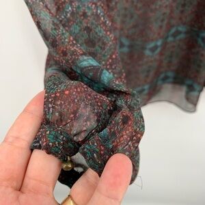 Beautiful Earth tones in this floaty Chiffon semi-sheer blouse. Turquoise pattern accent stripes.