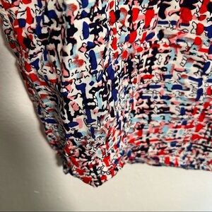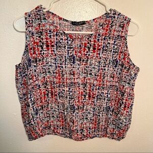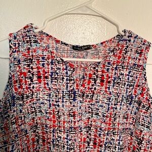 Great condition, minor wear. Zara Basic. Sleeveless shell blouse. Boxy fit. Keyhole front. White with red, pink, blue and black geometric pattern. No size/material tag, my best guess on size is a small; please see measurements to ensure proper fit. Pit to pit laying flat 19” Shoulder to hem 18”. All measurements are approximate and taken lying flat. Smoke free home.