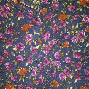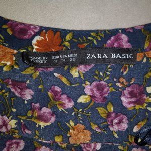 Zara basic Small Blouse. Light material. Blue background with purple and burnt orange floral print. 3/4 length sleeve. Pocket front. Intact Faux button detail goes halfway down front. (Extra replacement button included) Great condition.