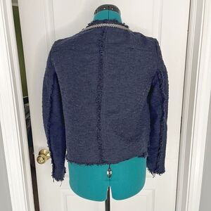 Zara Basic Textured Frayed Silver Trim Pocket Open Front Crop Jacket Blazer