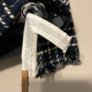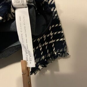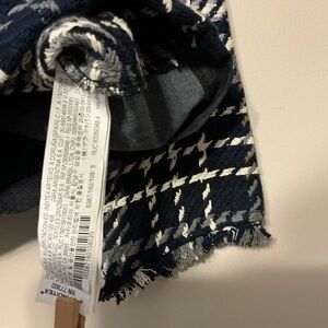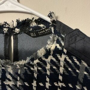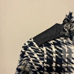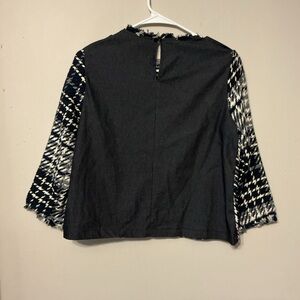 Black/white/grey shades tweed top with back neck button closure. Cute front black pockets and fringe at end of sleeves. About 17-18 inches pit to pit and 20-21 inches long.