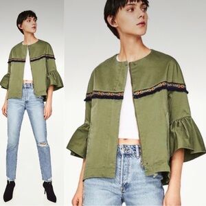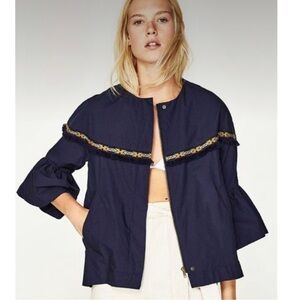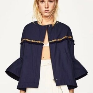 Zara Basic Western Navy Blue Bell Sleeve Fringe Aztec Trim Jacket Size XS NWT