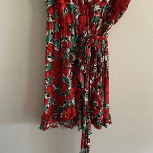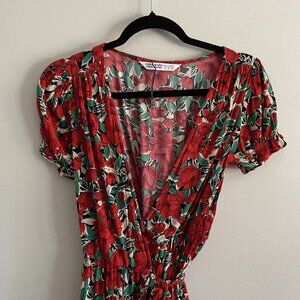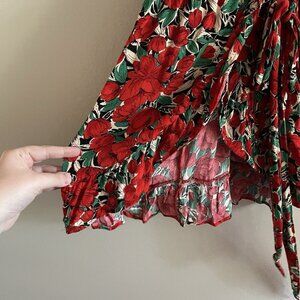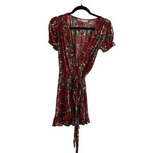 Zara Basic Women XS Red Floral V-Neck Puff Sleeves Ruffle Mini Wrap Dress