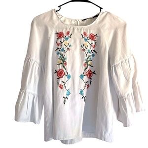 Zara Basic Women’s Floral Embroidered White Bell Sleeve Blouse Size Small