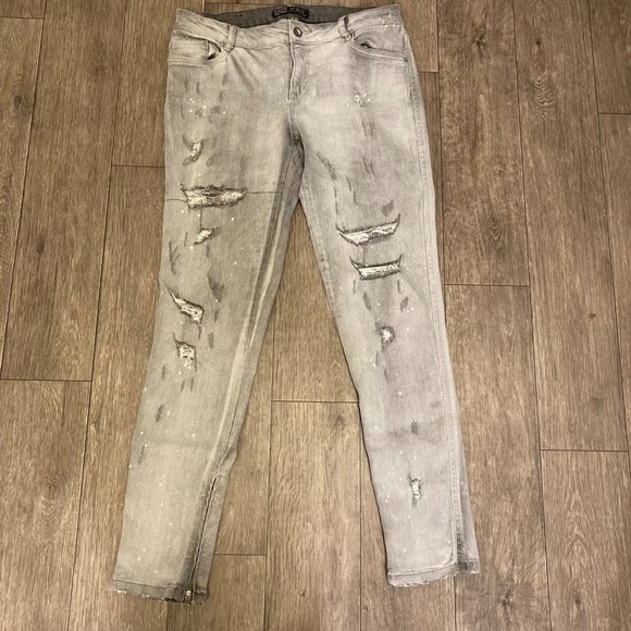 Zara Basic Z1975 Denim 8 Skinny Moto Zipper Ankle Jeans Distressed Gray