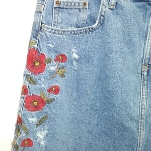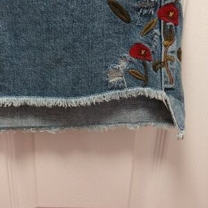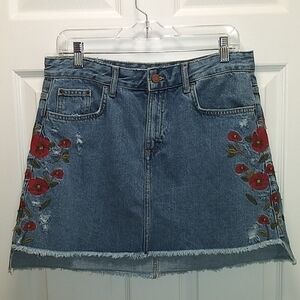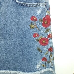 EUC denim high-low mini skirt with floral embroidery on sides. Front has 2 regular sized pockets and 1 mini pocket and back has 2 pockets. Smoke free home.