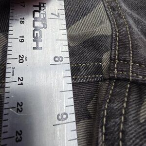 Gray camouflage print denim with heavy distressing on front and frayed hems