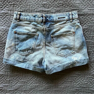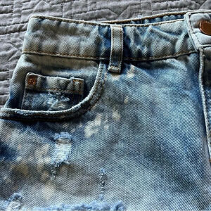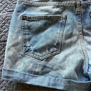 Distressed denim shorts with intentional bleach splatter marks. Cuffed with button and zipper closure. 100% cotton
