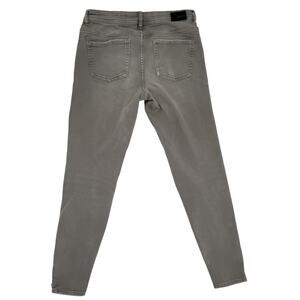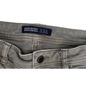 Stylish Zara Basic 1975 gray distressed skinny jeans in size 4/26. These trendy jeans feature a modern distressed design with front zipper pockets and ankle zippers, perfect for casual and streetwear looks. Made from a comfortable blend of materials, these jeans offer a great fit and a chic, versatile style.