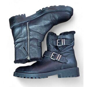 Zara Basic black leather moto combat boots zipper shearling lined EU41 US10