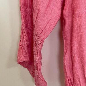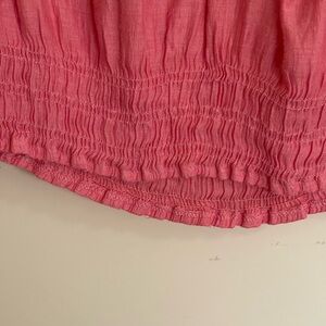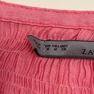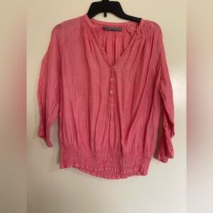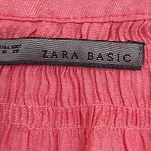 Zara coral blouse top for women in size M. It features a V-neckline, 3/4 fitted sleeves, and a pullover closure.