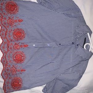 Blue and white pin striped, with red lace trim. A bit cropped, basically new