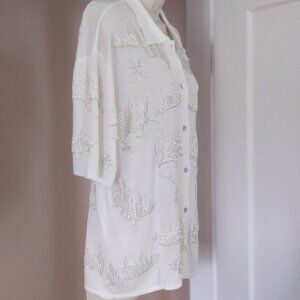 Beautiful, lightweight short sleeve polo sweater shirt. Bead appliqués with front button closure. Dress up or down, wear buttoned up or open as a cardigan. The color is an egg shell white with silver accent beads.