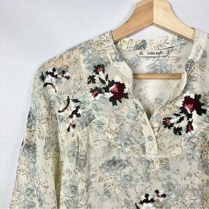 Zara Beige Floral Embroidered Long Sleeve Blouse S