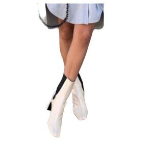 This boot from Zara is in great condition. It is in beige color. It features; Textured patent finish, Elastic black side goring, Square toes, Pull on boots with Block heel.