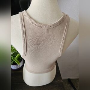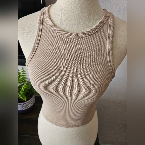 Stylish beige ribbed racerback tank top. Perfect for casual wear.