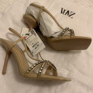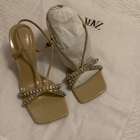 Elevate your style with these elegant Zara beige strappy sandals. Featuring a chic rhinestone detail, these sandals are perfect for any occasion.