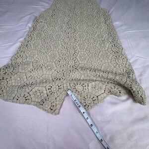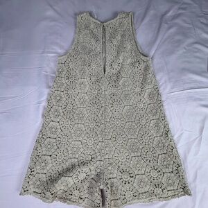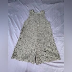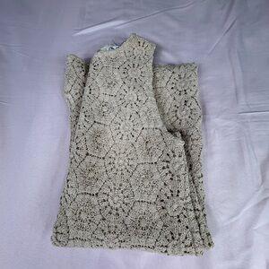 Chic beige lace blouse. Features intricate texture. Sleeveless design.