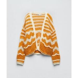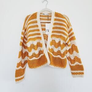 Zara Open Cardigan Knit Crochet Sweater Beige & Yellow Striped