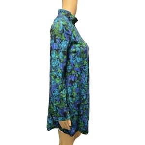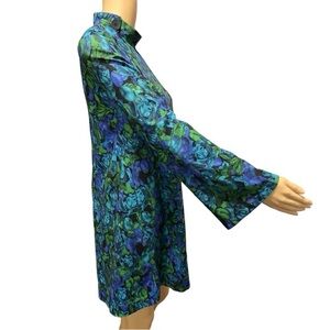 Beautiful rose design with long bell sleeves and a raised mock neck adorned with a black button