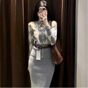Zara Belted Argyle Knit Sweater and Basic Knit Midi Skirt 2 Pieces Set