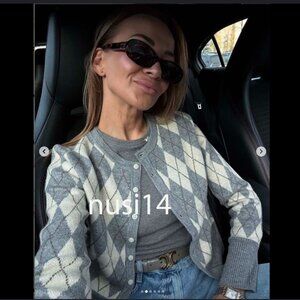 1. Zara Belted Argyle Knit Sweater: Chic gray knit sweater with argyle print detailing, and belt. Perfect for any occasion.