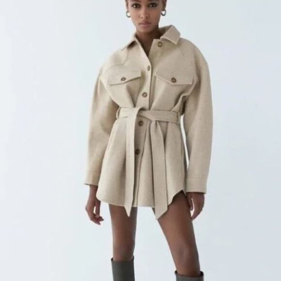 ✨ Great condition, super trendy Zara over shirt (shirt jacket) with button front closure, buttoned cuffs, front buttoned patch pockets and removable belt.