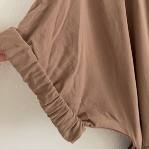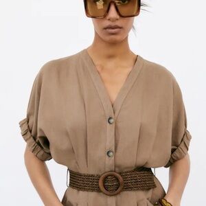 Zara Tan Jumpsuit V-neck dress with short sleeves with elastic cuffs. Belt with contrast wooden buckle. Pleat detail. Front button closure.