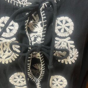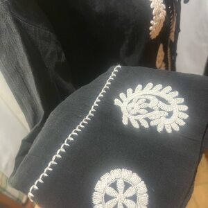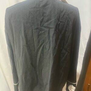 Elegant black jacket featuring white floral embroidery. Ideal for chic styling.