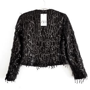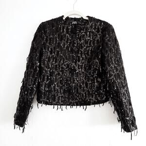 Zara Black Button Up Sequin Fringe Jacket Size Small