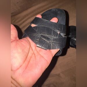 Chic black sandals with a croc-patterned design. Perfect for casual elegance.
