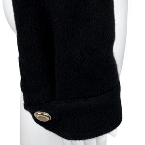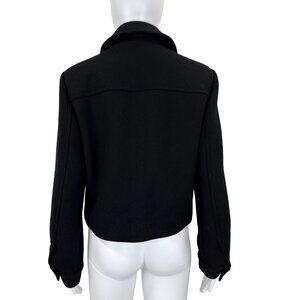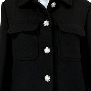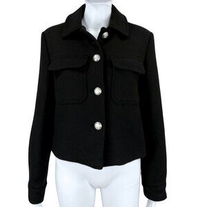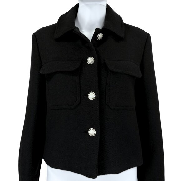 A timeless black cropped wool-blend jacket with clean lines, structured tailoring, and a polished minimalist silhouette. The silver-tone buttons and flap-style pockets add subtle sophistication, making this a piece that elevates both casual and dressy looks. Lightweight yet warm, it layers effortlessly over sweaters, camisoles, and dresses throughout fall, winter, and early spring.