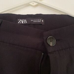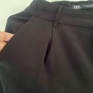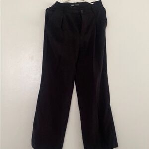 These Zara dress pants feature a sleek straight-leg design in a deep black hue, offering a timeless and sophisticated look. Crafted from a smooth fabric, they provide a comfortable fit with a regular waistline, making them perfect for formal occasions. The minimalist design ensures versatility and elegance in any setting.