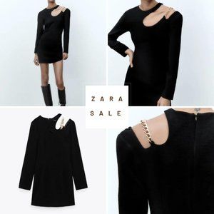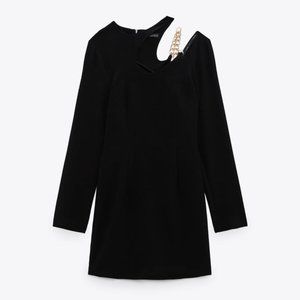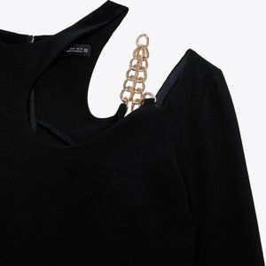 DRESS WITH ROUND NECK AND LONG SLEEVES. GOLD CHAIN DETAIL AND SLIT. BACK HIDDEN IN-SEAM ZIP CLOSURE.