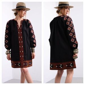 Zara Black Embroidered Balloon Sleeve Linen Dress