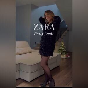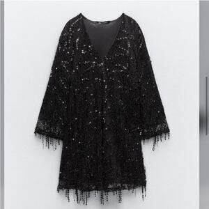 Zara Black FRINGED SEQUIN MINI DRESS Size Large