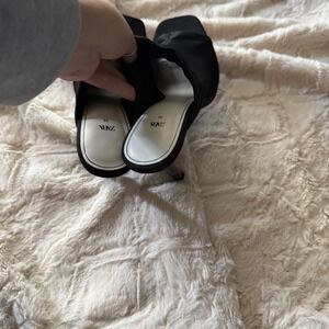 Keywords: Zara, black mules, square toe heels, stiletto heels, open toe mules, size 39, women's shoes, fabric heels, dress shoes, party shoes, heeled sandals, evening shoes, contemporary heels, minimalist shoes