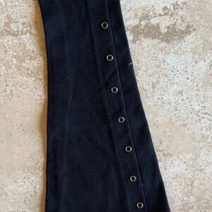 Black bell bottom high waisted stretch pants with silver grommets on the outer side of each leg. Elastic 1"waistband, pull on style.