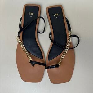 Zara Black Flat Sandals with Gold Chain Detail Stylish Women's Footwear Size 38