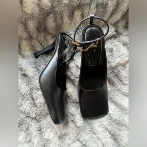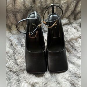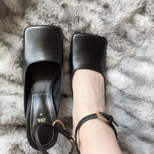 Step into elegance with these chic black Zara flat-toe heels, perfect for any occasion. These stylish heels feature a sleek design and adjustable ankle strap for a secure fit. Ideal for trying out at home or dressing up for a special event, these heels add a touch of sophistication to your look. Crafted for comfort and style, they are the perfect addition to your wardrobe for this season.