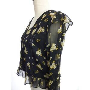 Zara Black Floral Chiffon Blouse Top Medium Boho Flutter Sleeve Semi Sheer