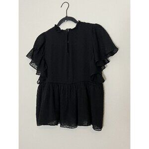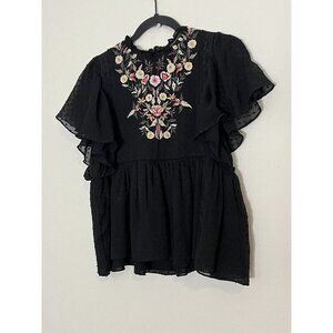 Zara Black Flutter Sleeve Polka Dot Blouse With Floral Embroidery Size Small