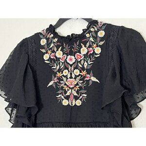 Zara Woman’s Black Flutter Sleeve Polka Dot Blouse With Multicolor Floral Embroidery.