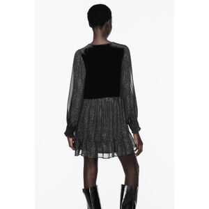 Zara Black Gold Metallic V-Neck Long Sleeve Ruffle Hem Mini Vest Dress (NWT)