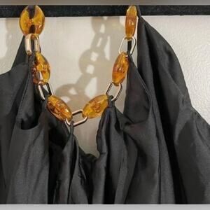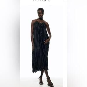 ZAR Black Creased /Crinkle effect oversized midi dress . Round neckline with tortoise shell/metal appliqués thin straps